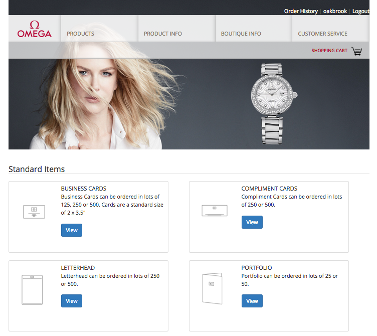 OMEGA required an internal print store for their boutiques worldwide. An internationally accessible site was created in Lavarel to enable boutiques to custom design their own stationary as needed, and seamlessly send in their monthly orders.
